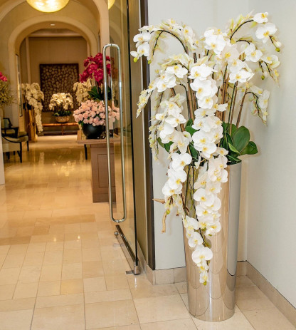 The ultimate luxury statement, this design features a high gloss stainless steel tapered cone planter in stainless steel paired with beautiful cascading white phalaenopsis orchids. Each piece is carefully crafted and polished to achieve a luxurious mirror finish. No need to water these beauties! Durable, they will last you years, and will remain beautiful year round! Designed with the upmost attention to detail and manufactured from top quality material, this piece is both luxurious and realistic.
