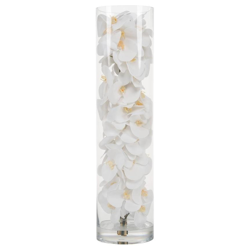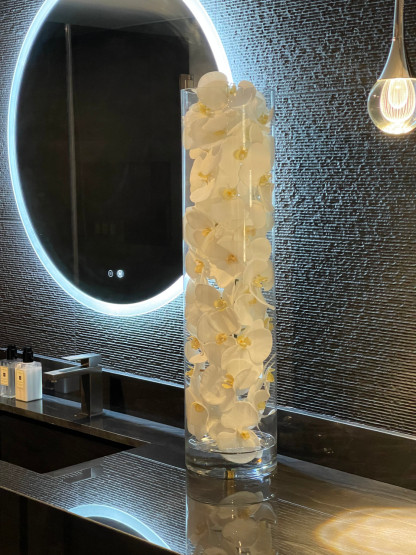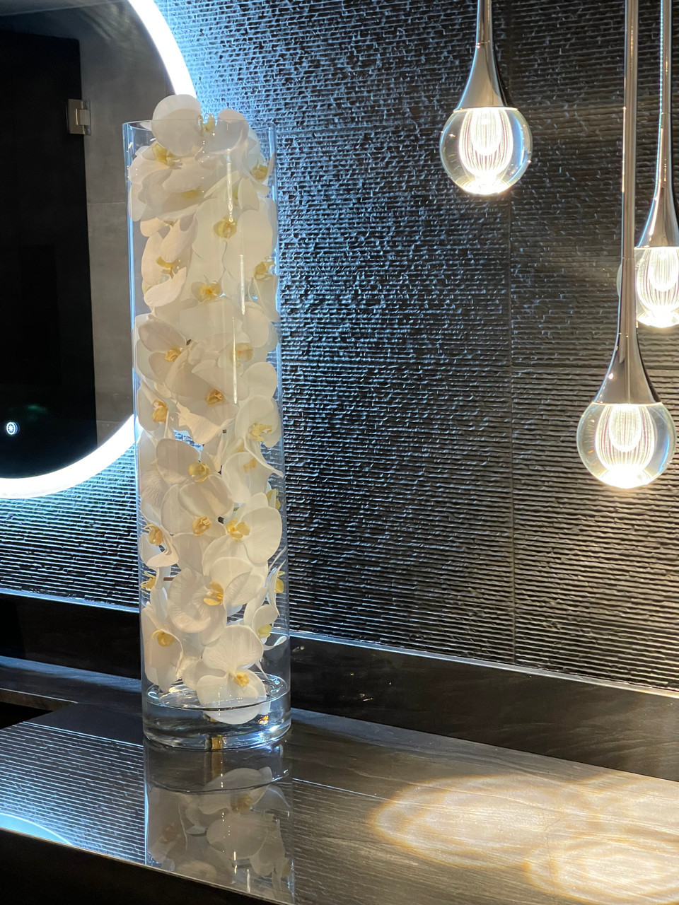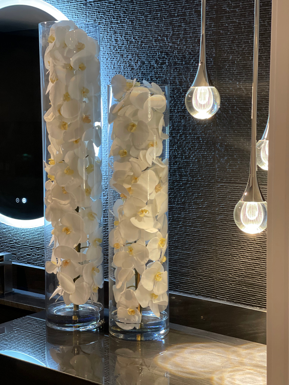 White phalaenopsis orchids anchored in “Illusion” water- completely contained inside a glass cylinder for a modern and sophisticated look. Grouped in three different sizes (40”, 32”, and 28”), paired or elegantly standing alone, the simplicity of this vase makes it perfect for any space and decor style. These white phalaenopsis orchids in cylinder vase are also great for any event. These vases are very versatile and can be used for any occasion, whether you are in need for an attractive centerpiece or a stunning and sophisticated home glass decor. Hand-blown crystal clear glass not machine made. Crafted with thick glass and a stable bottom for the perfect table centerpiece.