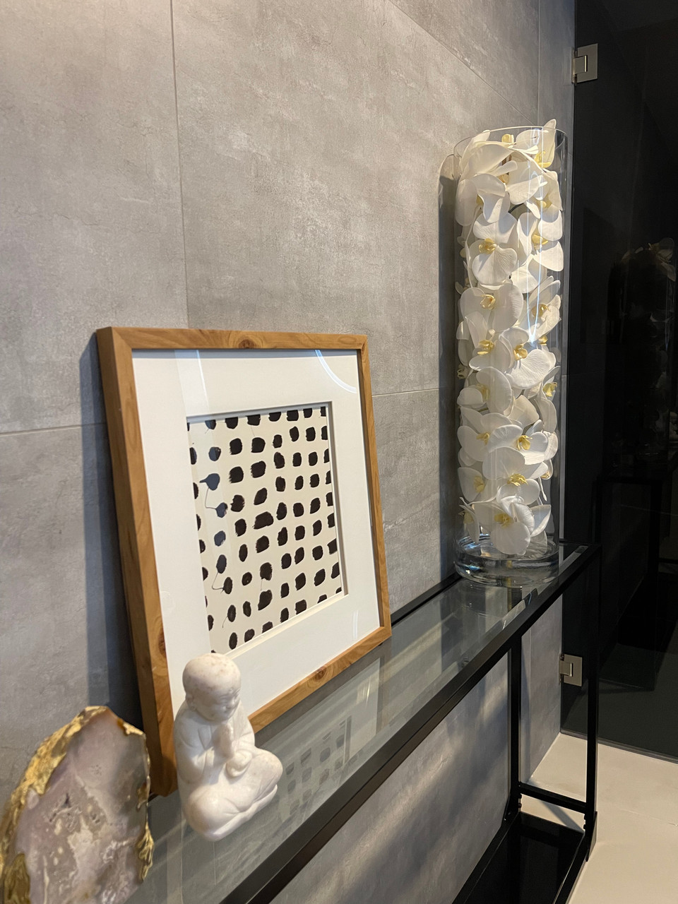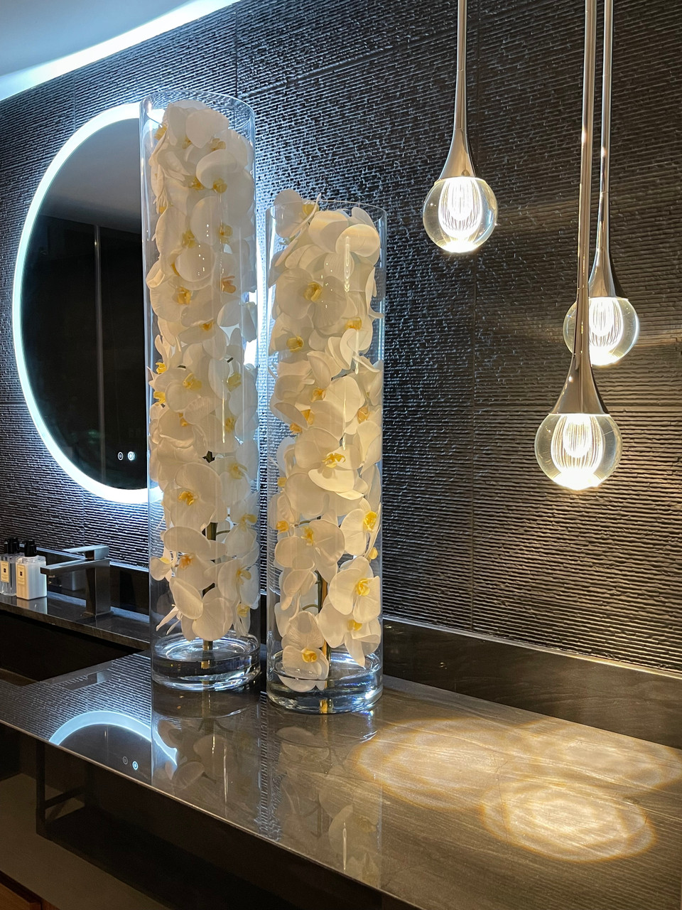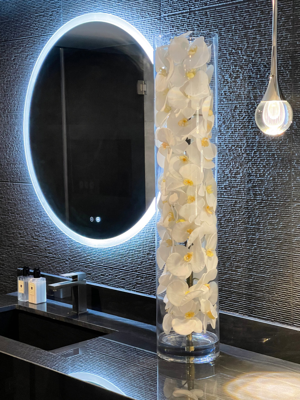 White phalaenopsis orchids anchored in “Illusion” water- completely contained inside a glass cylinder for a modern and sophisticated look. Grouped in three different sizes (40”, 32”, and 28”), paired or elegantly standing alone, the simplicity of this vase makes it perfect for any space and decor style. These white phalaenopsis orchids in cylinder vase are also great for any event. These vases are very versatile and can be used for any occasion, whether you are in need for an attractive centerpiece or a stunning and sophisticated home glass decor. Hand-blown crystal clear glass not machine made. Crafted with thick glass and a stable bottom for the perfect table centerpiece.