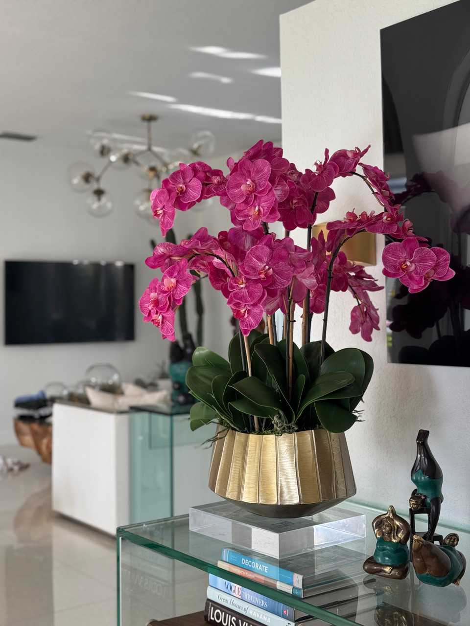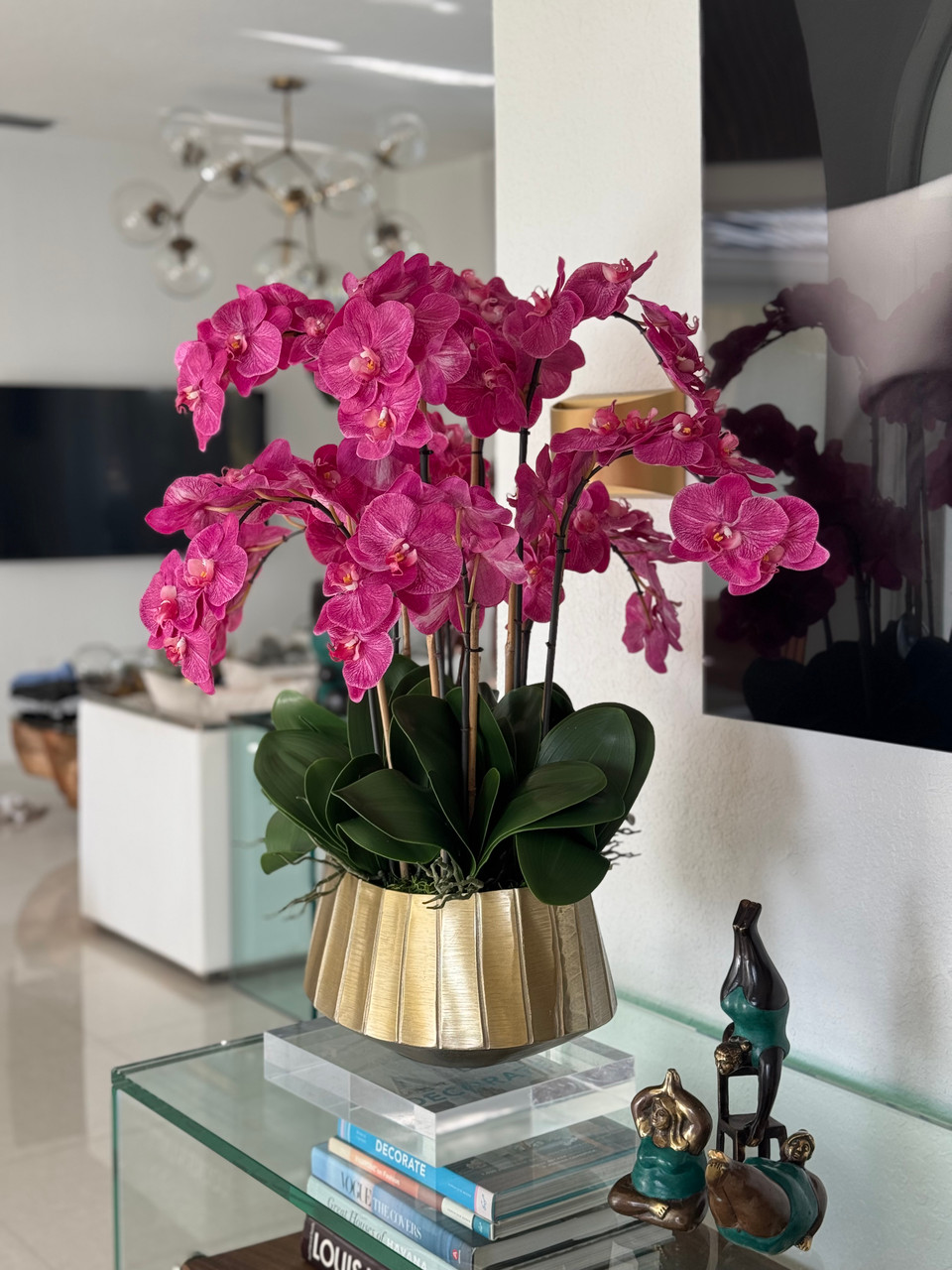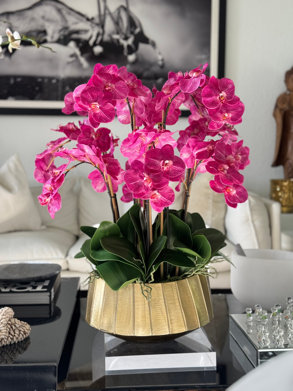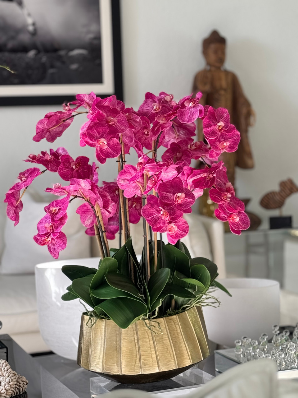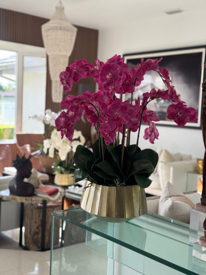 A cascading display of elegant Phalaenopsis orchids flows beautifully from the Helena bowl, which features a ridged gold surface and a wide oval shape¡ªoffering a modern twist on a timeless classic. Accented with lush green broad foliage and the signature leaves unique to the Phalaenopsis orchid, this arrangement is perfectly sized to serve as a stunning centerpiece in any room. Its versatile design makes it an effortless addition to both contemporary and traditional spaces.?
