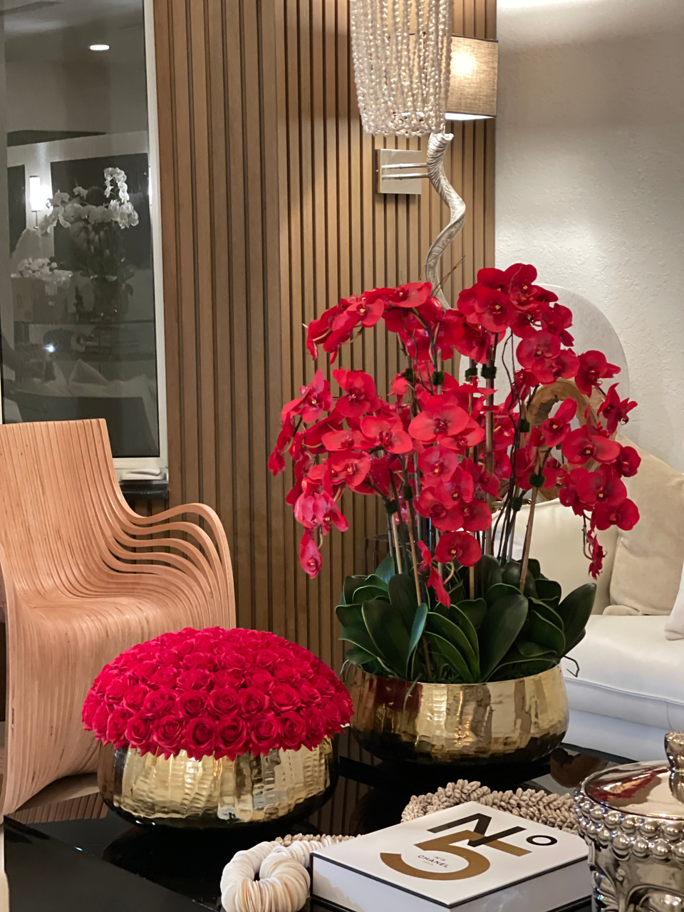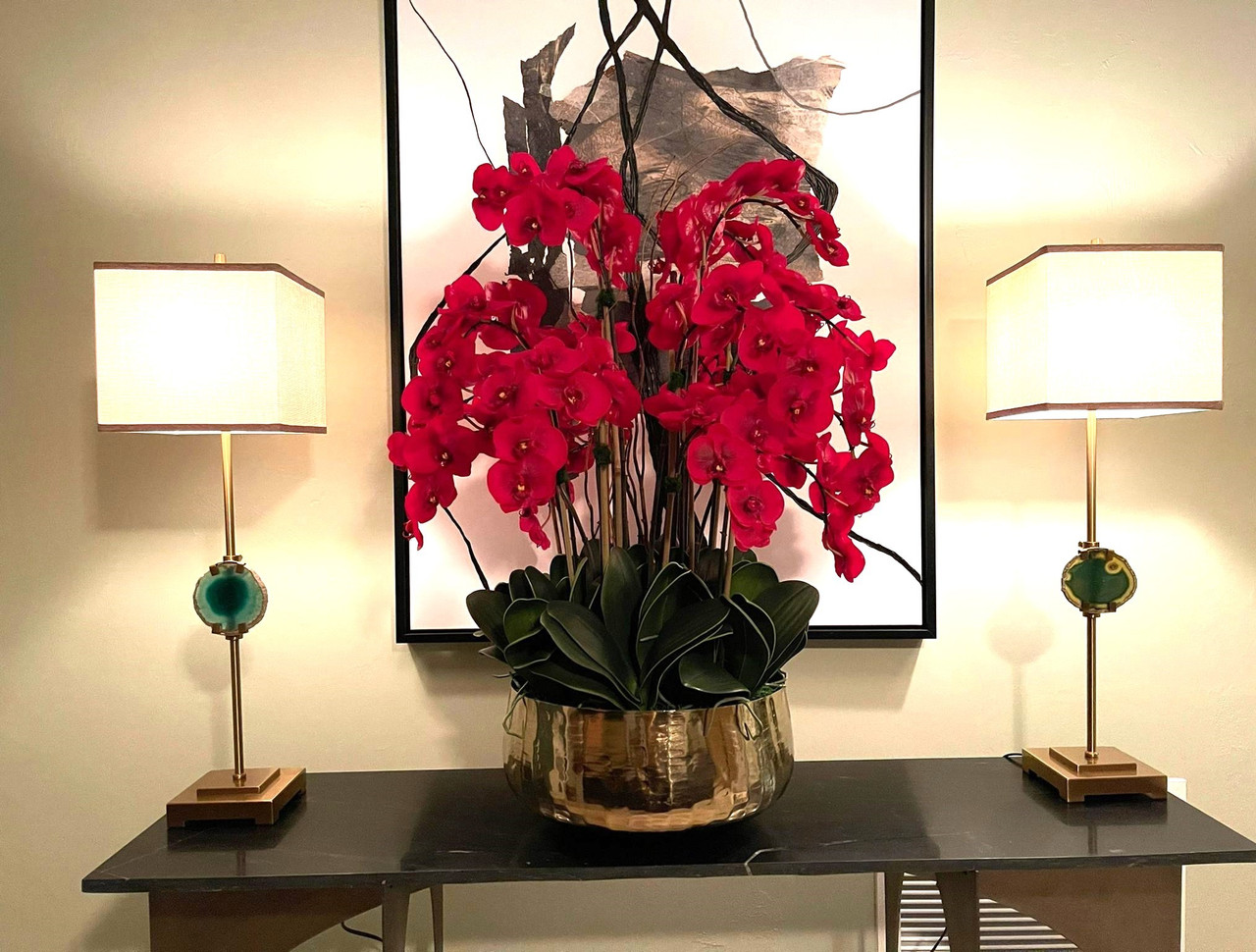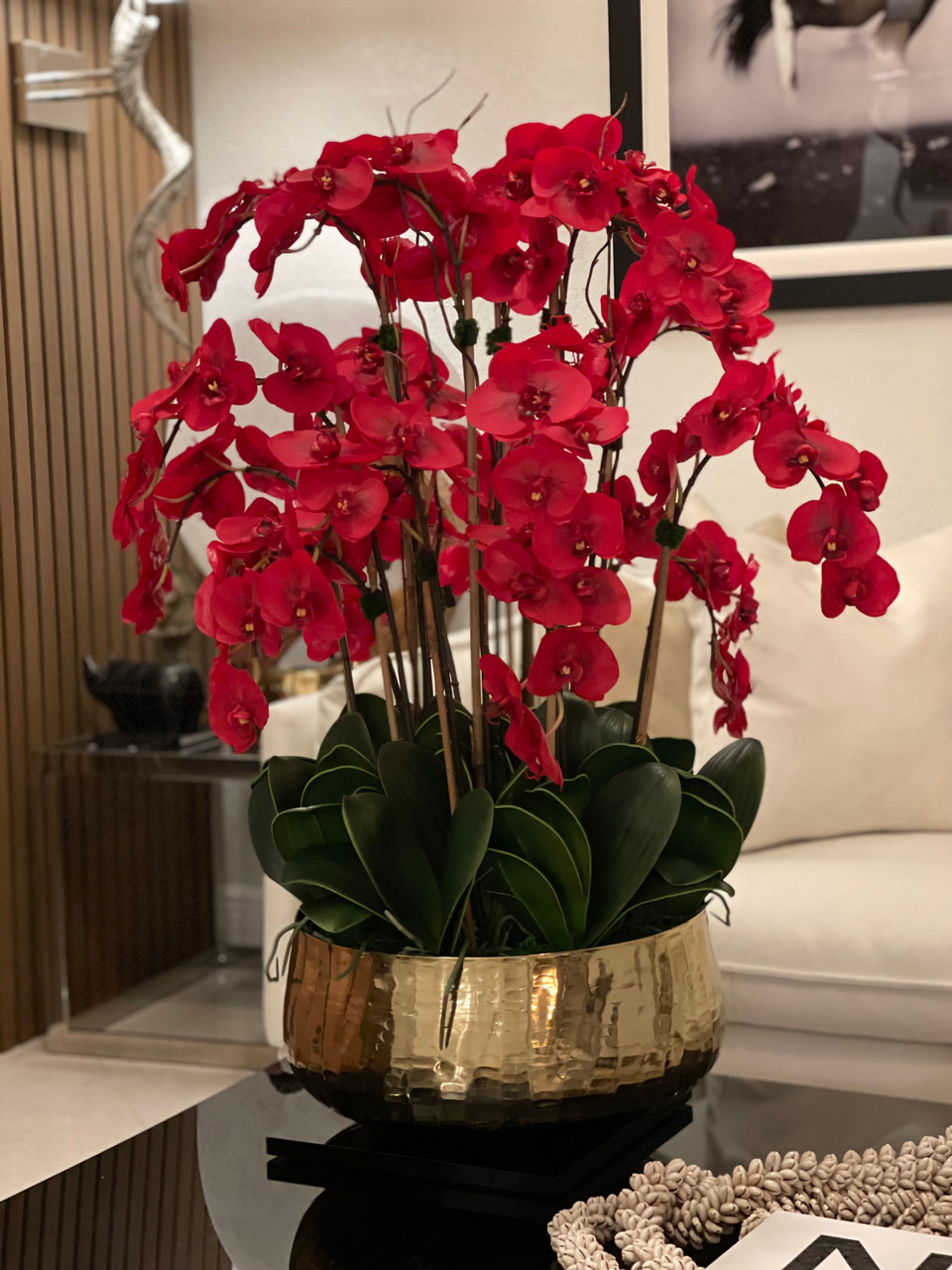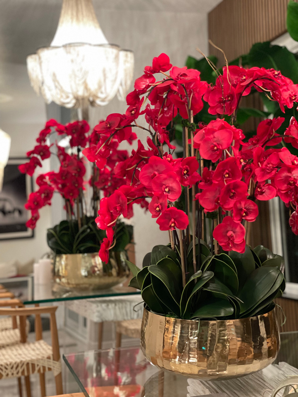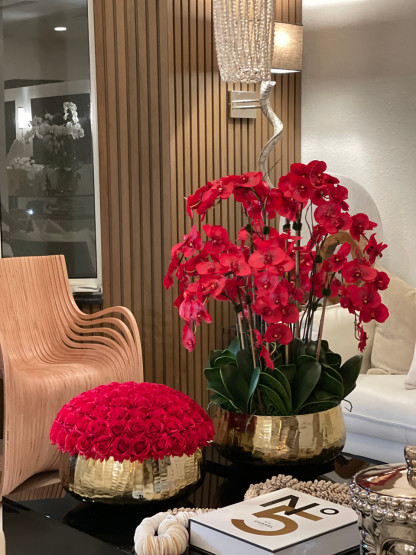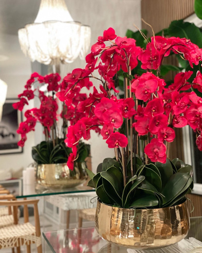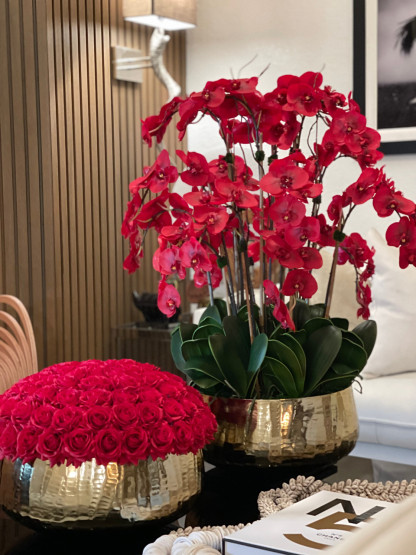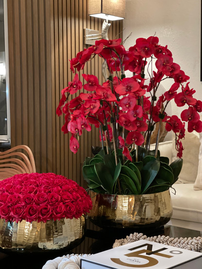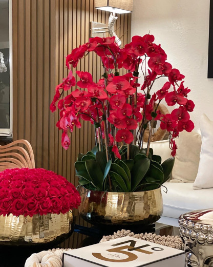Red Phalaenopsis Orchids Floral Arrangement in Large Gold Planter