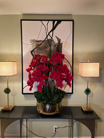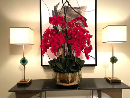 Graceful and exotic, the orchid has symbolized integrity, nobility, and luxury for centuries. Our enduring, garnet red phalaenopsis arrangement captures the artistry and spirit of natural orchids. It¡¯s prized for its profusion of perfect blooms. Vertical bamboo stakes, broad green leaves, and a genuine moss base add to the realism of this arrangement.?Often called the ¡°moth orchid,¡± the phalaenopsis is a favorite among our designers for its dense leaves, elegantly arching sprays and lovely blooms. Our remarkably lifelike arrangement is staked into a moss-covered base in an elegant gold planter for a timeless, authentic look that will endure for years to come. This arrangement is just the right size and is versatile enough to use as a coffee table centerpiece, a dining room or console table. It has a luscious tropical feel that will add vibrancy, color and elegance to any room.