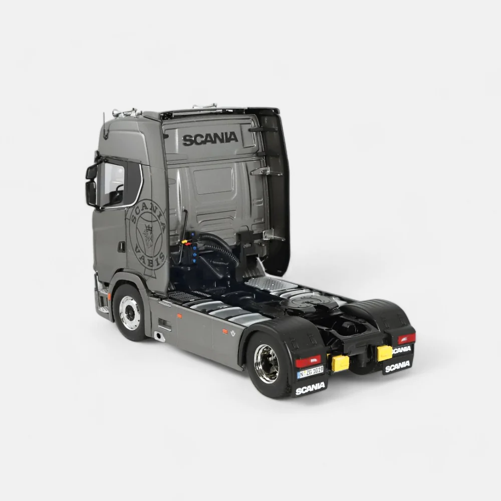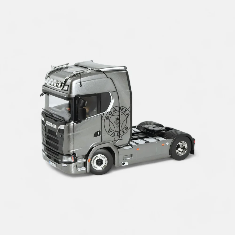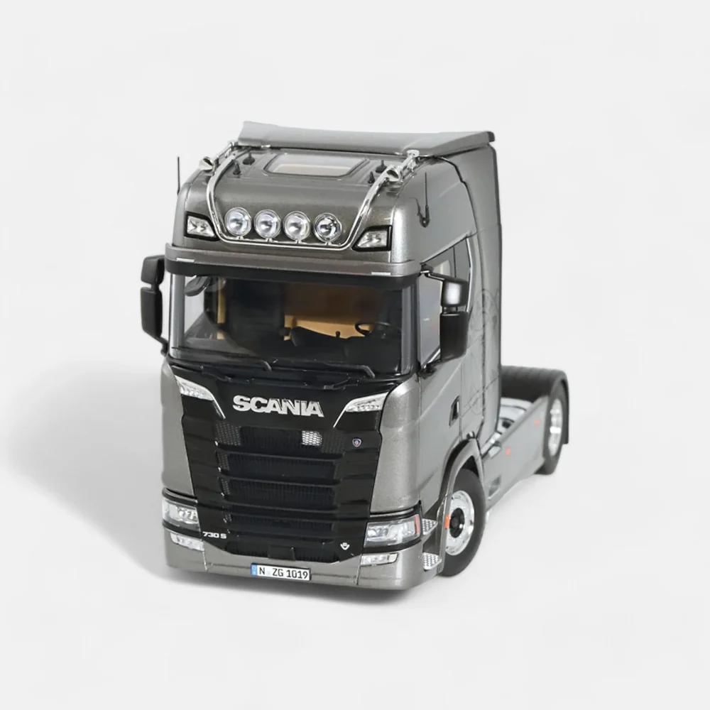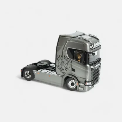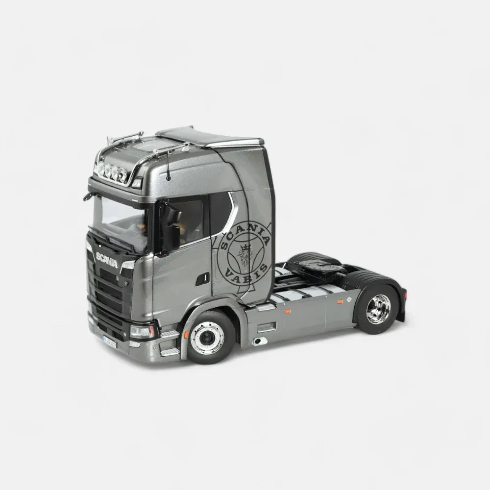 Introducing the Scania V8 730S 4x2, a highly detailed 1:18 scale model truck tractor in striking fictionblue with the iconic Greif logo. Measuring 331 mm in length, 166 mm in width, and 214-222 mm in height, this meticulously crafted replica features a steerable front axle, tiltable driver's cab, and a detailed V8 engine. The model also includes a locking fifth wheel coupling, adjustable armrests, a suspended chassis, an opening service flap at the front, and two brake chocks. With an adjustable roof spoiler, this model perfectly captures the robust design and engineering excellence of the original truck, making it a must-have for any enthusiast.