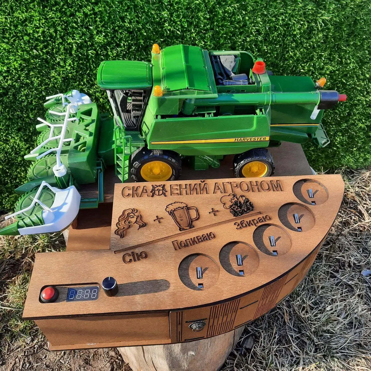 The "Green-Maxi" Tractor Shot Dispenser is a creatively designed conversation starter and the ultimate party centerpiece. This unique device combines a highly detailed combine harvester model with a fully functional multi-shot dispensing system, seamlessly blending entertainment with practicality. Meticulously handcrafted, it serves not only as a practical beverage tool but also as a collectible display piece.(Product includes wine glass)