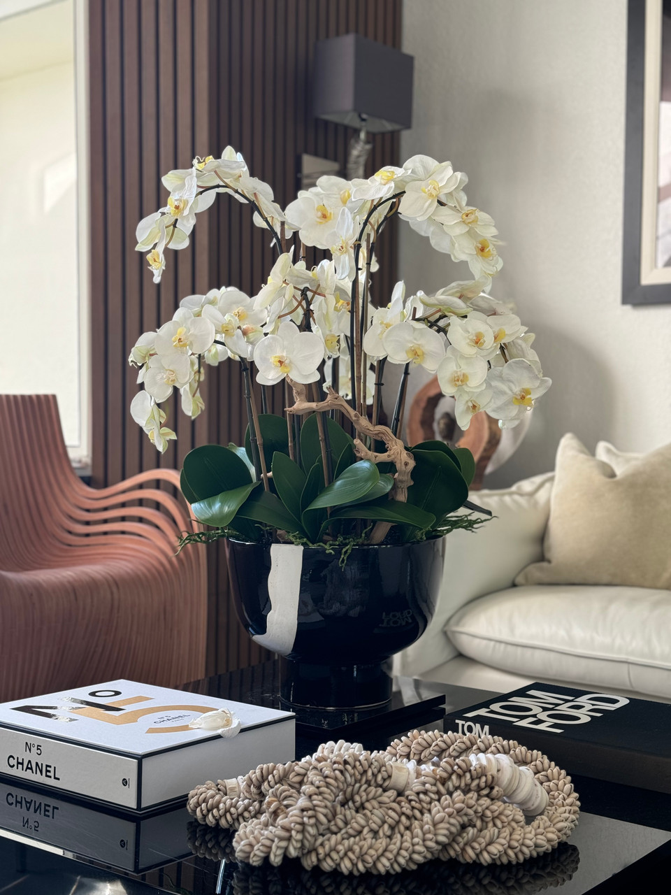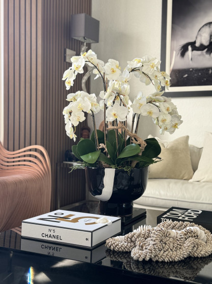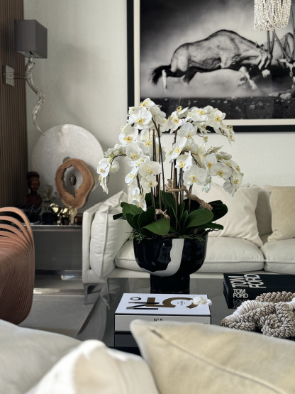 The white orchids, with their timeless beauty and grace, create a serene focal point, while the black and white Kempff planter adds a touch of modern sophistication. This combination of delicate natural beauty and sleek design brings both luxury and refinement to any room. The striking contrast between the pure white orchids and the bold black and white planter creates a visually stunning effect, making it the perfect centerpiece for console tables, entrance tables, or beside a sofa. With its elegant and elevated aesthetic, this arrangement transforms your space into a place of elegance and style.