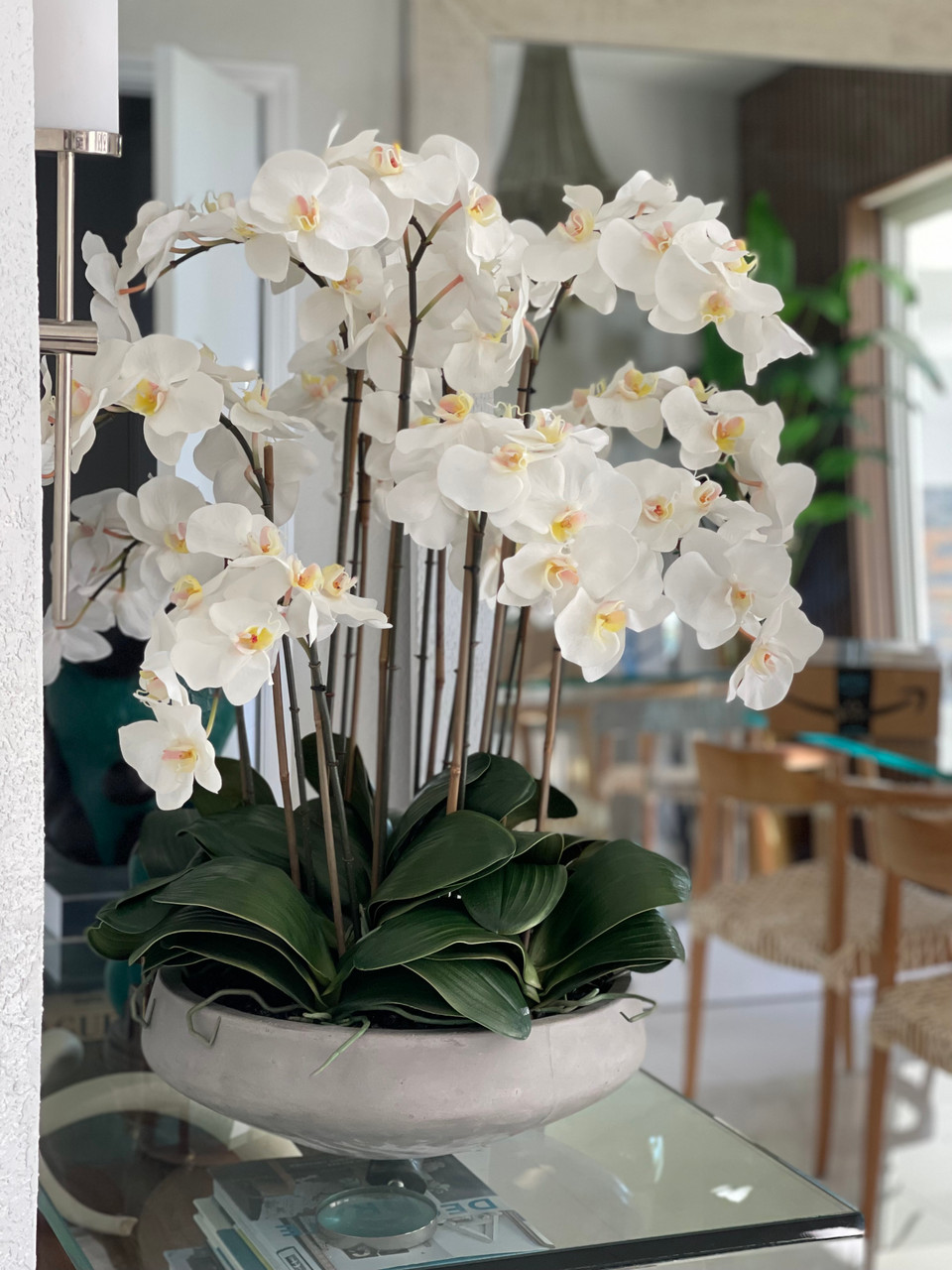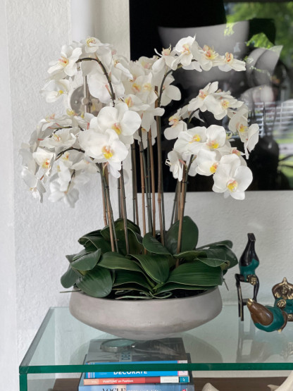 White Phalaenopsis?Orchids in Newport bowl.? Beautiful and natural looking faux orchids delicately?arranged in an oversized concrete bowl. Paired together, this piece adds a natural and modern aesthetic appeal to your decor. Its lightweight fiberstone construction and white colored orchids make this arrangement highly versatile.