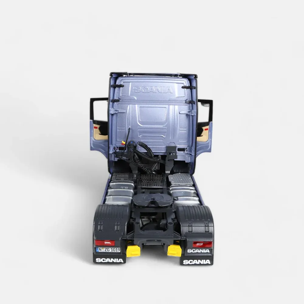 Introducing the Scania V8 730S 4x2, a highly detailed 1:18 scale model truck tractor in striking fictionblue with the iconic Greif logo. Measuring 331 mm in length, 166 mm in width, and 214-222 mm in height, this meticulously crafted replica features a steerable front axle, tiltable driver's cab, and a detailed V8 engine. The model also includes a locking fifth wheel coupling, adjustable armrests, a suspended chassis, an opening service flap at the front, and two brake chocks. With an adjustable roof spoiler, this model perfectly captures the robust design and engineering excellence of the original truck, making it a must-have for any enthusiast.