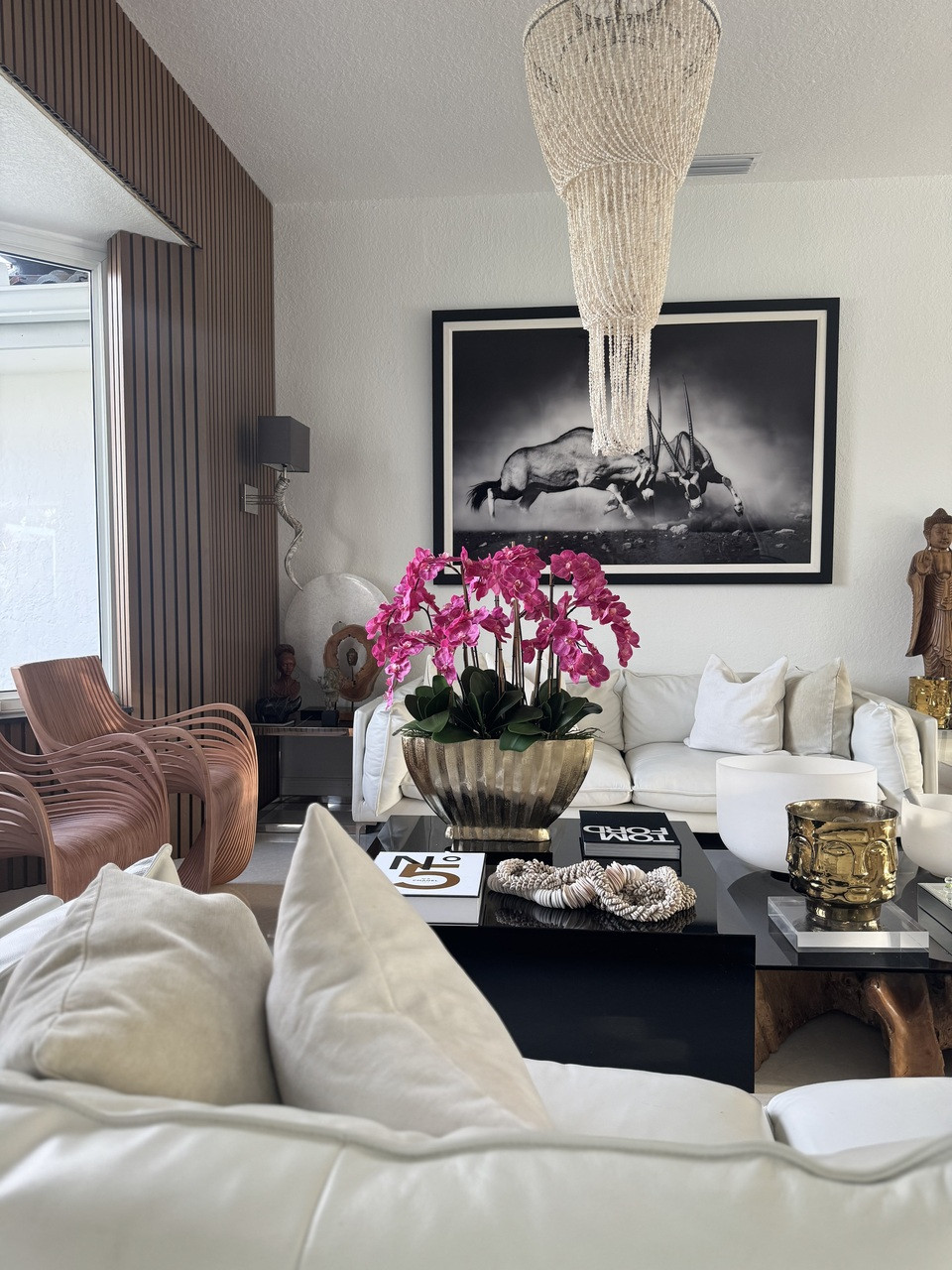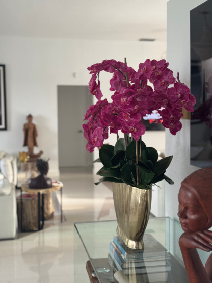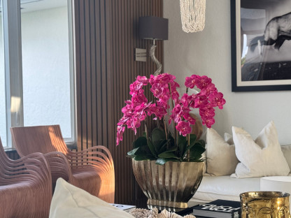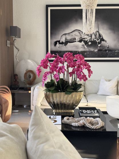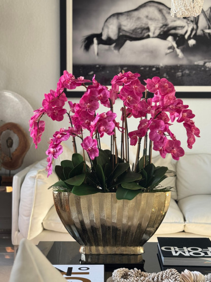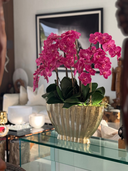 The timeless beauty of orchids is perfectly complemented by the gold Vivien Vase. This exquisite arrangement, reminiscent of a graceful ballet of white orchids, radiates sophistication and charm. Artfully crafted, the orchids are arranged in the Vivien Vase, a gold, metal-footed vessel with a stunning pleated surface. Its narrow, elongated opening makes it ideal for display in spaces like console tables or buffets. The oversized design evokes the delicate spread of an open fan of white orchids, creating a striking and elegant statement.
